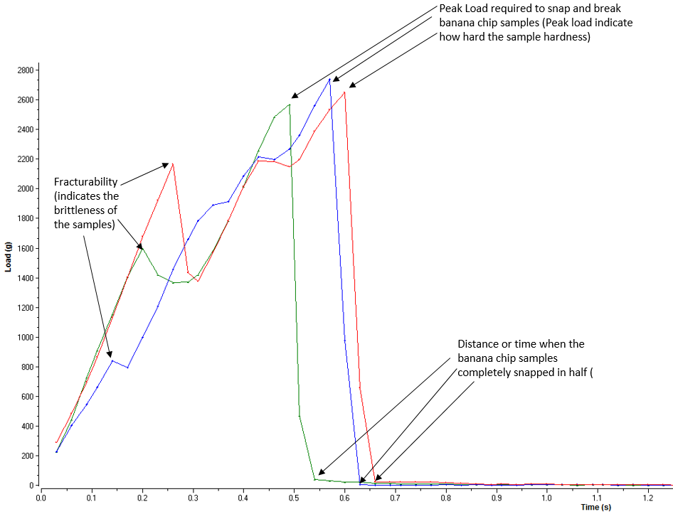 This test compresses the banana chips to a set distance and measures the amount of force required to bend or break the sample.